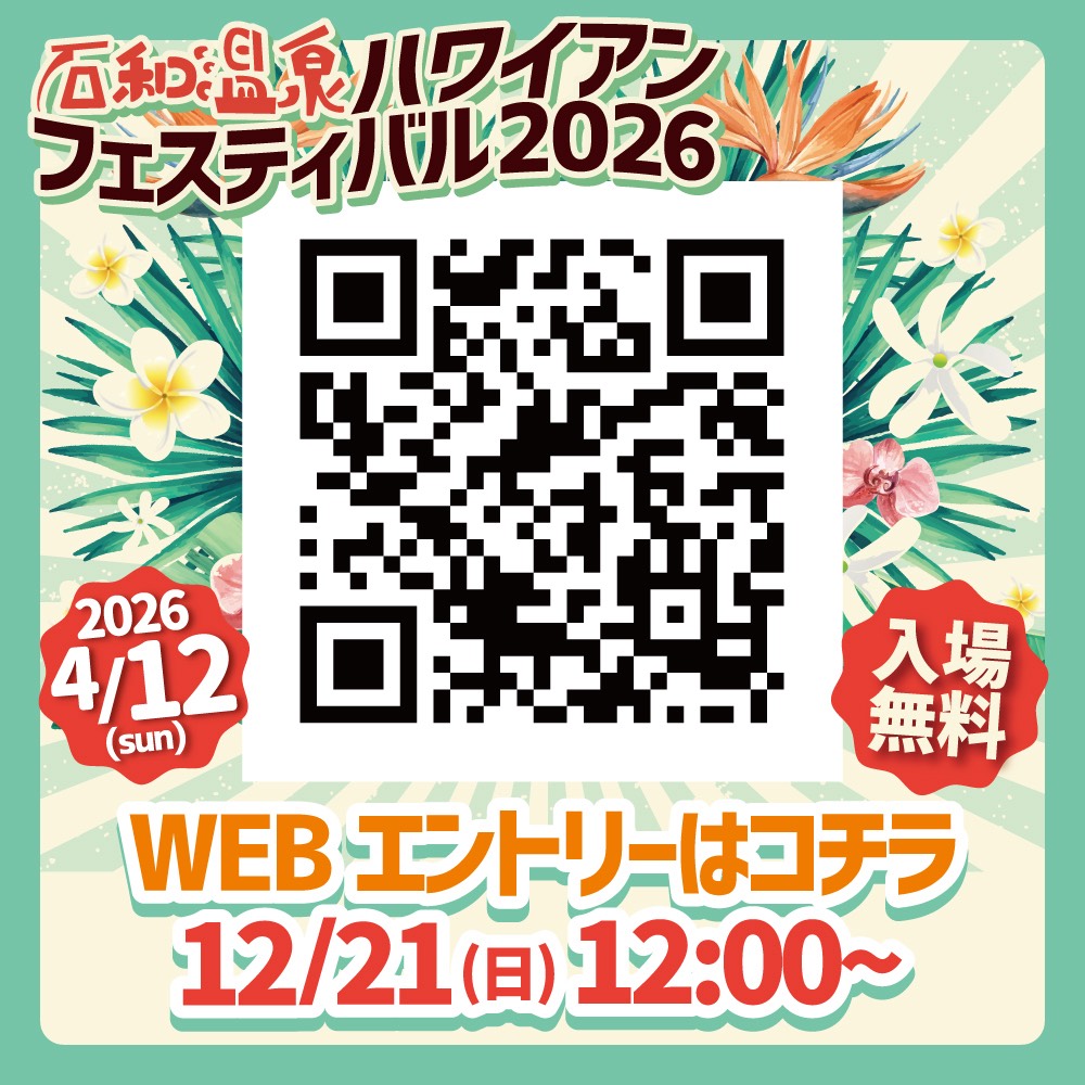 Aloha! 来年の「石和温泉ハワイアンフェスティバル2026」2026年4月12日(日)に開催が決定しました!早速ですが、12月21日(日)12:00〜出演者エントリーが開始されます。 まず、出演者概要をダウンロードし、よくお読みください。そして、QRコードからエントリーをしてくださいね。皆様のご応募お待ちしております! 2025-12-13